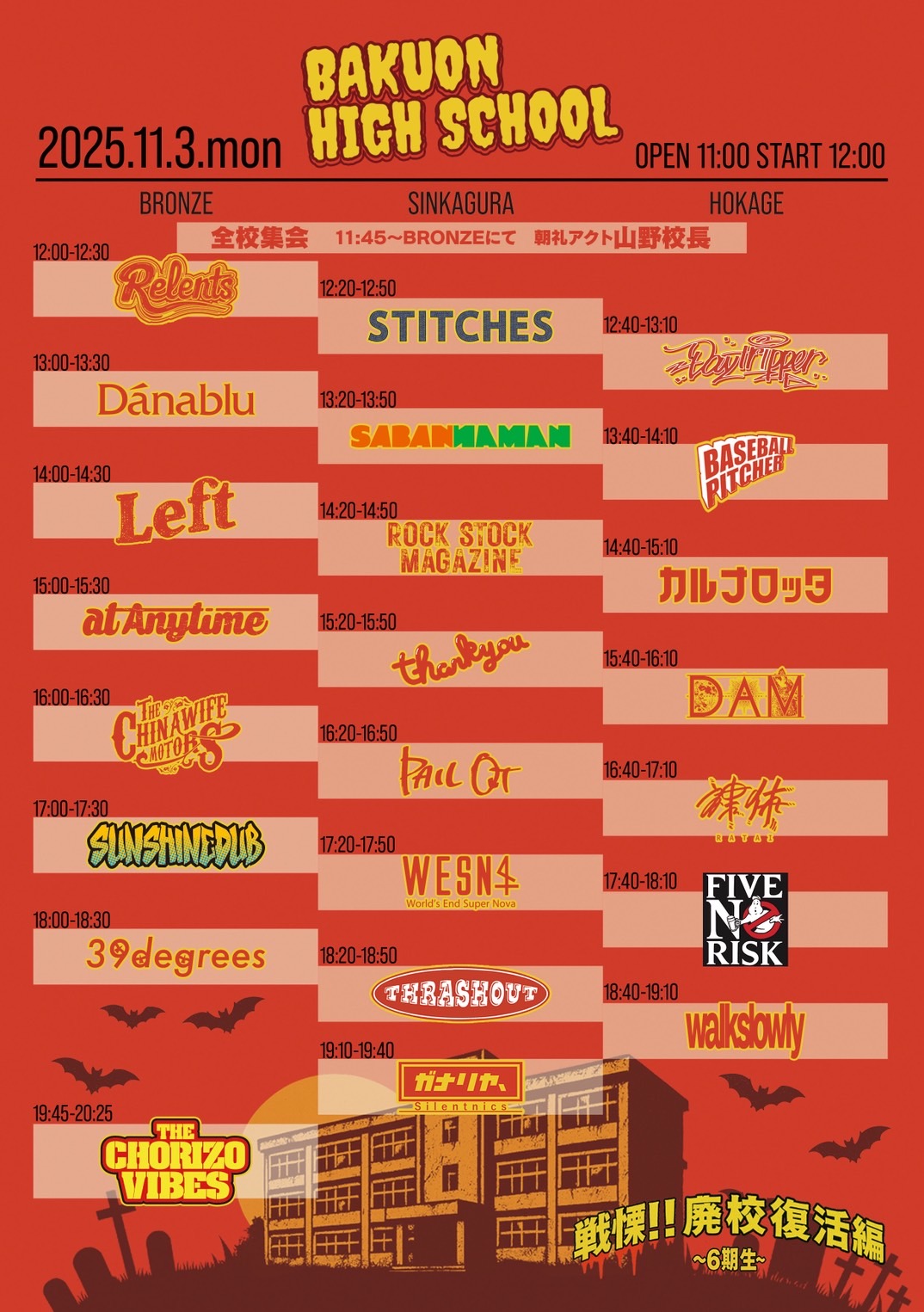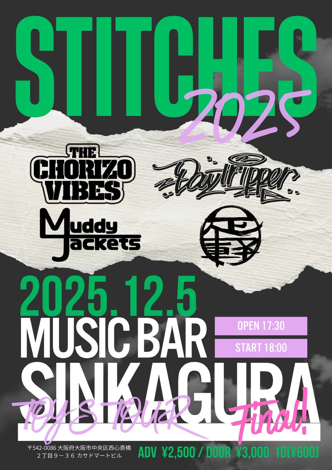 NEWS 2025.11.07 VINTAGE×WESN pre. 「寝屋川大忘年会」 2025.11.07 STITCHES 2025.11.06 ちゅんpre.「平田町酔狂曲」 @鈴鹿ANSWER 2025.10.27 爆音ハイスクール 戦慄!!廃校復活編 6期生タイムテーブル解禁!! MORE NEWS NEW RELEASE SMACKDOWN 2024.7.23. Digital Release MORE RELEASE LIVE SCHEDULE 2025.11.20(木) 東心斎橋CLUB STOMP MASSATSU GIG vol.61 2025.11.24(月) 心斎橋KINGCOBRA 「DRUNK ON THE GRAVE! Vol.3」 2025.11.28(金) 西中島BAR RAINBOW THE CHORIZO VIBES × Day tripper pre. 2025.12.05(金) 心斎橋新神楽 STITCHES MORE SCHEDULE MOVIE MORE MOVIE